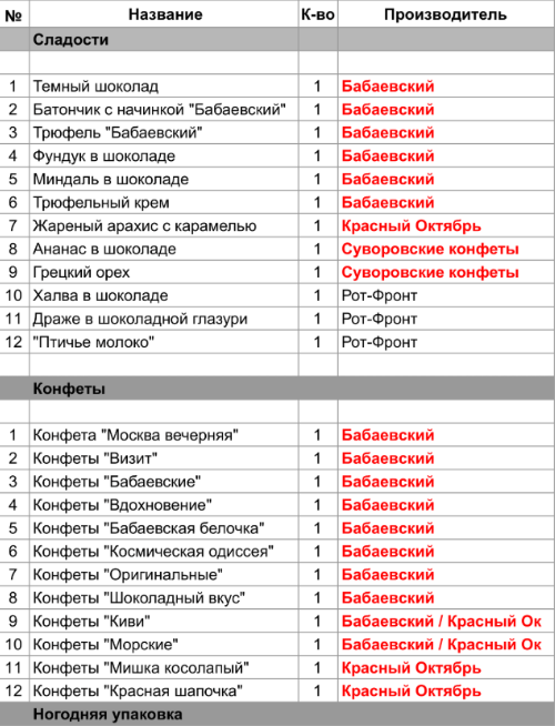 Темный шоколад (1 шт), Батончик с начинкой "Бабаевский" (1 шт), Трюфель "Бабаевский" (1 шт), Фундук в шоколаде (1 шт), Миндаль в шоколаде (1 шт), Трюфельный крем (1 шт), Конфета "Москва вечерняя" (1 шт), Конфеты "Визит" (1 шт), Конфеты "Бабаевские" (1 шт), Конфеты "Вдохновение" (1 шт), Конфеты "Бабаевская белочка" (1 шт), Конфеты "Космическая одиссея" (1 шт), Конфеты "Оригинальные" (1 шт), Конфеты "Шоколадный вкус" (1 шт), Конфеты "Киви" (1 шт), Конфеты "Морские" (1 шт)