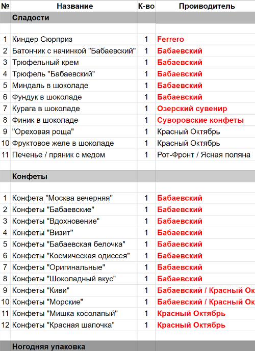 Батончик с начинкой "Бабаевский" (1 шт), Трюфельный крем (1 шт), Трюфель "Бабаевский" (1 шт), Миндаль в шоколаде (1 шт), Фундук в шоколаде (1 шт), Конфета "Москва вечерняя" (1 шт), Конфеты "Бабаевские" (1 шт), Конфеты "Вдохновение" (1 шт), Конфеты "Визит" (1 шт), Конфеты "Бабаевская белочка" (1 шт), Конфеты "Космическая одиссея" (1 шт), Конфеты "Оригинальные" (1 шт), Конфеты "Шоколадный вкус" (1 шт), Конфеты "Киви" (1 шт), Конфеты "Морские" (1 шт)