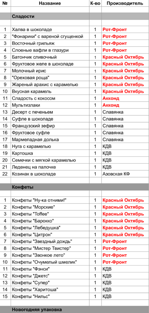 Нуга с карамелью (1 шт),Картошка (1 шт),Семечки с мягкой карамелью (1 шт),Леденец на палочке (1 шт),Конфеты "Фэнси" (1 шт),Конфеты "Джетс" (1 шт),Конфеты "Супер" (1 шт),Конфеты "Харитоша" (1 шт),Конфеты "Нильс" (1 шт)