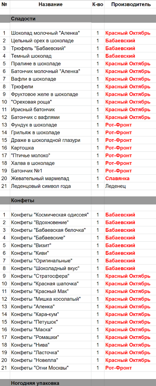 Шоколад молочный "Аленка" (1 шт), Пралине в шоколаде (1 шт), Батончик молочный "Аленка" (1 шт), Вафли в шоколаде (1 шт), Трюфели (1 шт), Фруктовое желе в шоколаде (1 шт), "Ореховая роща" (1 шт), Ирисный батончик (1 шт), Батончик с вафлями (1 шт), Конфеты "Красная шапочка" (1 шт), Конфеты "Красный Мак" (1 шт), Конфеты "Мишка косолапый" (1 шт), Конфеты "Аленка" (1 шт), Конфеты "Кара-кум" (1 шт), Конфеты "Петушок" (1 шт), Конфеты "Маска" (1 шт), Конфеты "Ромашки" (1 шт), Конфеты "Нива" (1 шт), Конфеты "Ласточка" (1 шт), Конфеты "Барокко" (1 шт)